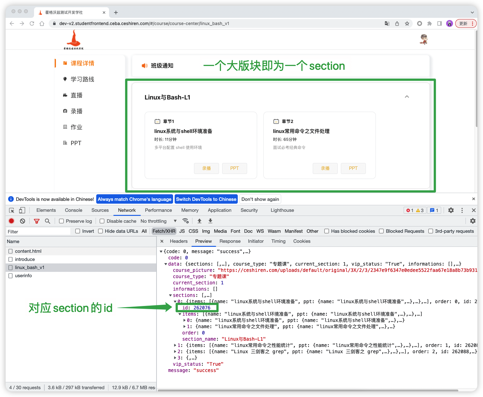 - 在学员系统的页面打开开发者的网络页签,找到章节的 id